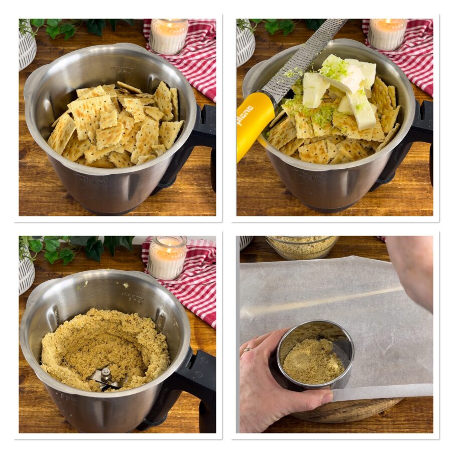 Pon los crackers en el vaso de la batidora, añade la mantequilla, una generosa ralladura de limón y 1 cucharada de zumo.