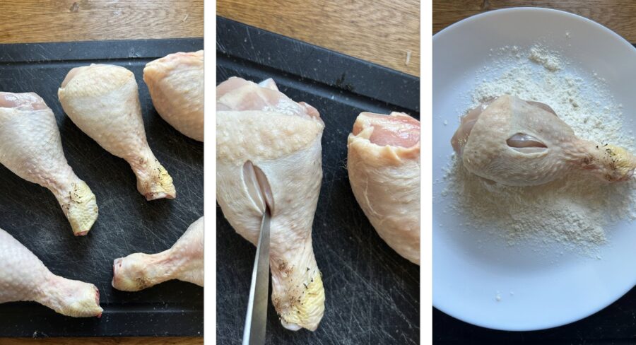 Preparad los muslos de pollo eliminando las posibles plumas que queden, quemándolas con un soplete o sobre el fuego del fogón. Con un cuchillo afilado, practicadles un corte en cuatro lados y pasadlos por la harina.