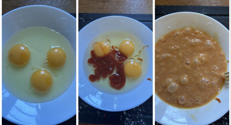 Batid los huevos con la salsa barbacoa o el ketchup.