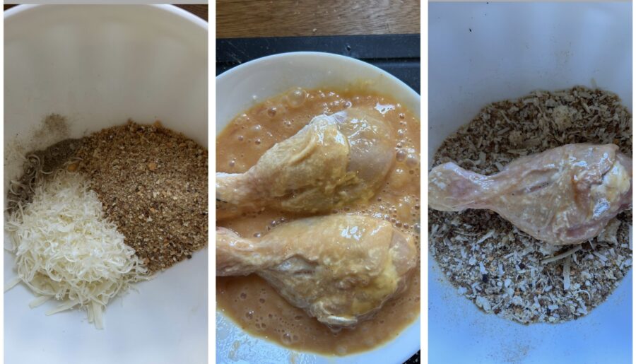 Pasad el pollo enharinado por los huevos y luego por el empanado. Repetid para hacer un empanado doble: otra vez huevos y pan rallado, presionando bien con las manos para que quede adherido en una capa gruesa.