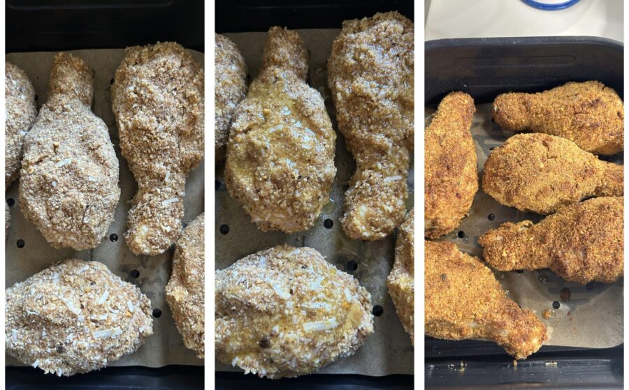 Este pollo preparado así debe servir y comerse inmediatamente; si os sobra, podéis guardarlo en la nevera y consumirlo en las 24 horas posteriores recalentándolo siempre en la freidora o en el horno, pero no estará tan bueno como recién hecho.