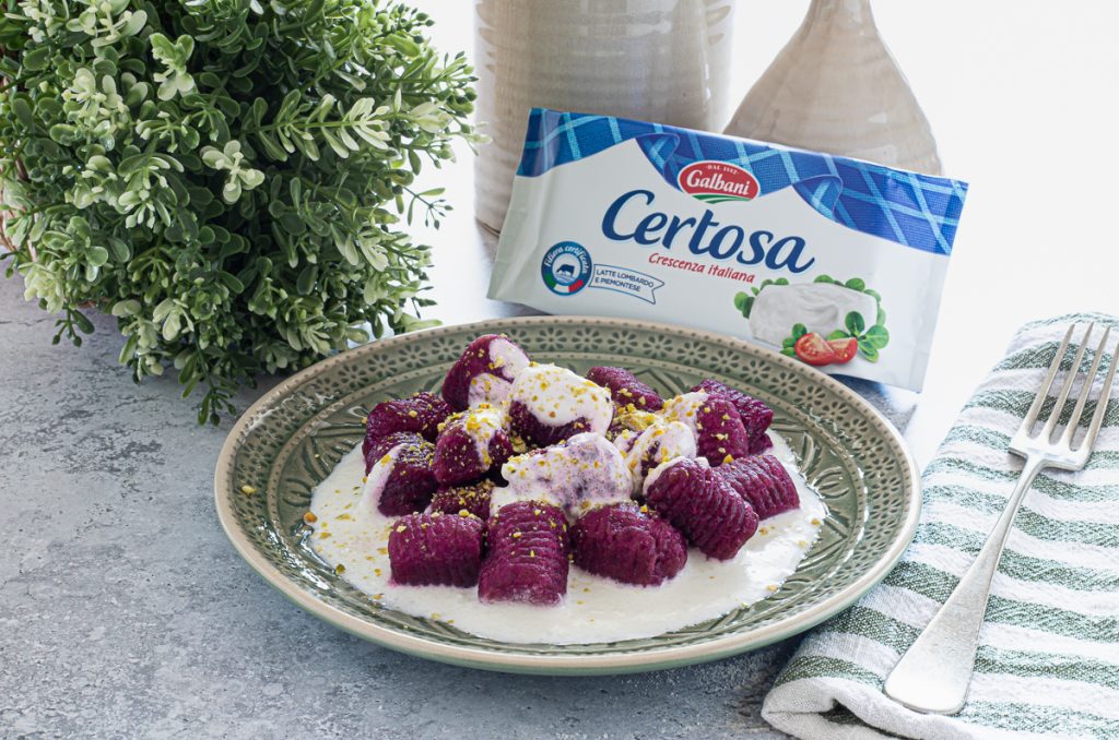 Ñoquis de remolacha con crema de Certosa y parmesano. ¿Cuántas veces, después de preparar los ñoquis, no sabéis cómo condimentarlos? Hace unos días, por ejemplo, preparé los ñoquis de remolacha o betabel, los había querido hacer desde hacía tiempo y finalmente me decidí. Una vez listos, sin embargo, no sabía cómo aderezarlos; por suerte en mi nevera la Crescenza Certosa Galbani nunca falta y así, con ésta y un poco de parmesano, adorne mis ñoquis, creando una salsa de acompañamiento fácil, rápida y, sobre todo, ¡deliciosa! ¿Queréis probar a preparar este plato tan rico y particular? Vamos a la cocina, pero antes de poner las manos en la masa os recuerdo que si queréis estar al tanto de todas mis recetas, podéis seguir mi página de Facebook (aquí), mi perfil de Instagram (aquí).