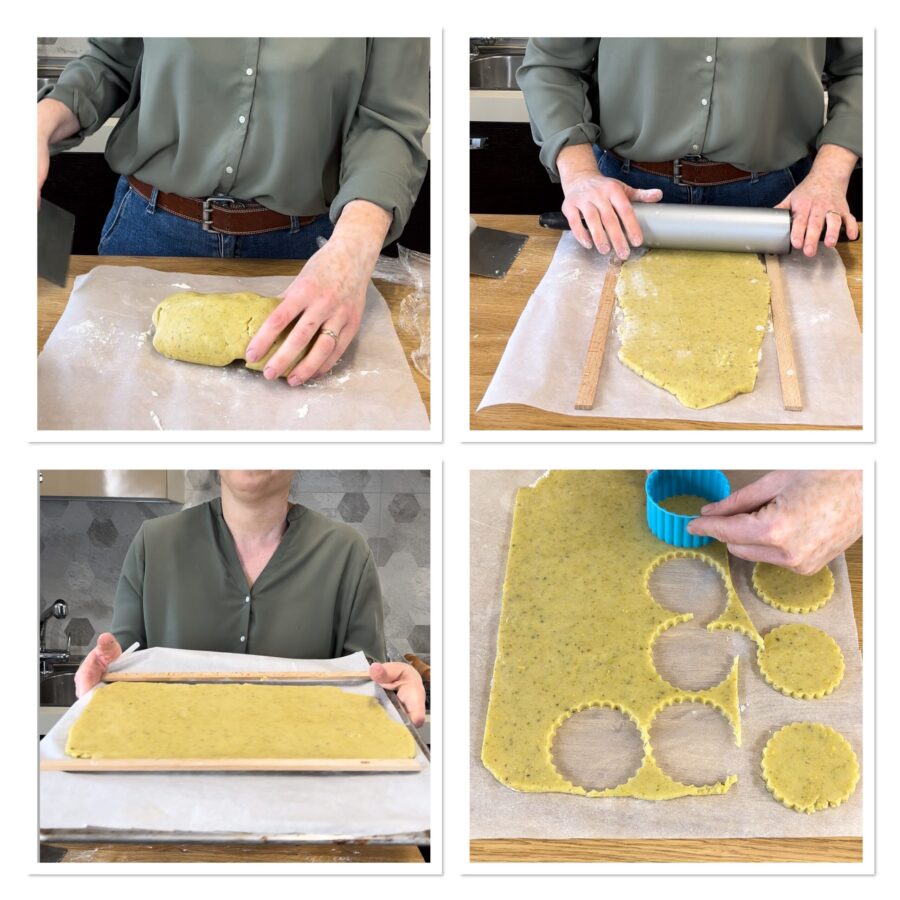 Refrigera 30 minutos y, una vez que la lámina esté firme, corta las galletas con el cortador redondo del tamaño que prefieras; yo usé uno en forma de flor de 8 cm de diámetro. En la mitad de los discos haz otro hueco en el centro de unos 2 cm o un poco menos.