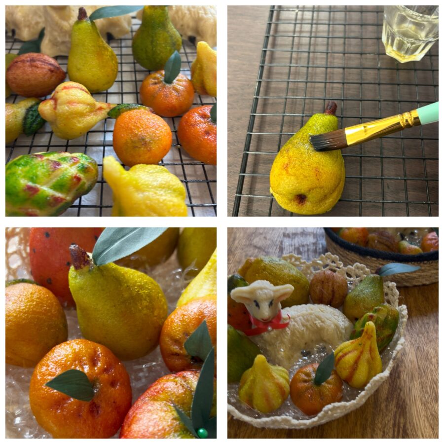 Si queréis modelar frutas en su lugar, ayudad con film transparente: colocad el film dentro del molde y rellenad con la pasta reale. Desmoldad y dejad secar 24 h antes de aplicar una primera capa de color.