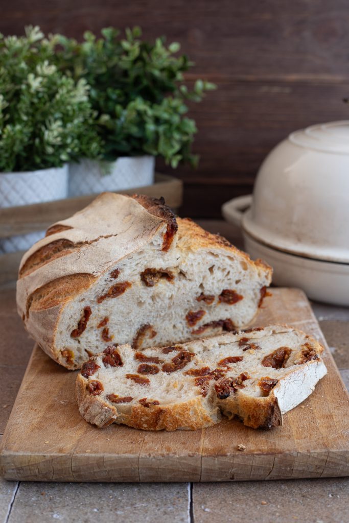 Distribuid los tomates secos, previamente hidratados durante 10 minutos en agua tibia, escurridos y cortados, y enrollad formando un cilindro. Enharinad bien tanto el cilindro de masa como la cesta de fermentación; colocad la masa con la parte de cierre hacia arriba y dejadla en un lugar cálido otras 4 h, luego movedla al frigorífico durante 6-8 h (una noche). Transcurrido el tiempo, si el pan está bien fermentado, proceded inmediatamente a la cocción; de lo contrario, dejad que complete su levado fuera del frigorífico. Precalentad el horno a 220°C o a la máxima temperatura alcanzable y calentad al mismo tiempo la olla de hierro fundido colocándola en su interior. Volcad la primera hogaza sobre un papel de horno, marcadla con una cuchilla para que no se abra al azar durante la cocción y colocadla sobre la olla ya caliente.