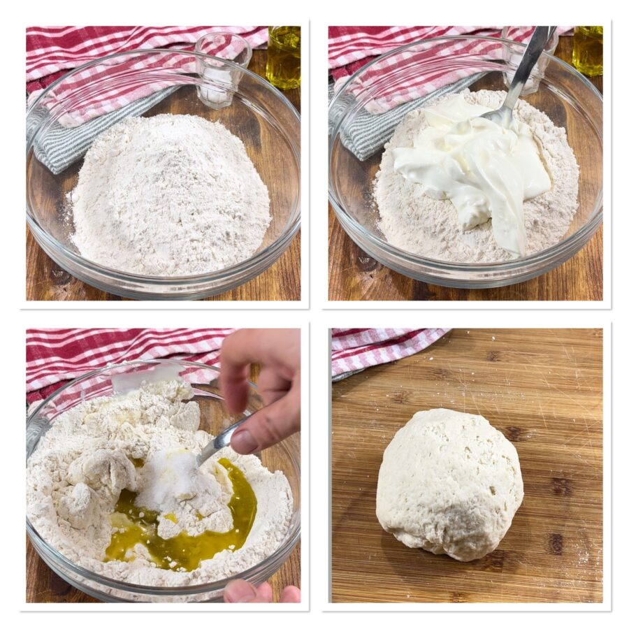 Recoged la harina en un bol; podéis usar cualquier tipo de harina, también harina 00, integral, sémola o harinas de cereales antiguos; lo importante es que se pueda formar una masa elástica, por lo que las harinas de arroz o de legumbres, que no contienen gluten, deben descartarse. Incorporad el yogur natural blanco, ya sea griego o tradicional, y mezclad. Ajustad la cantidad de yogur según las necesidades de vuestra masa y las harinas utilizadas. Añadid la sal, el aceite y la levadura y mezclad; trabajad la masa en el bol y luego sobre la superficie para amasar durante unos minutos.