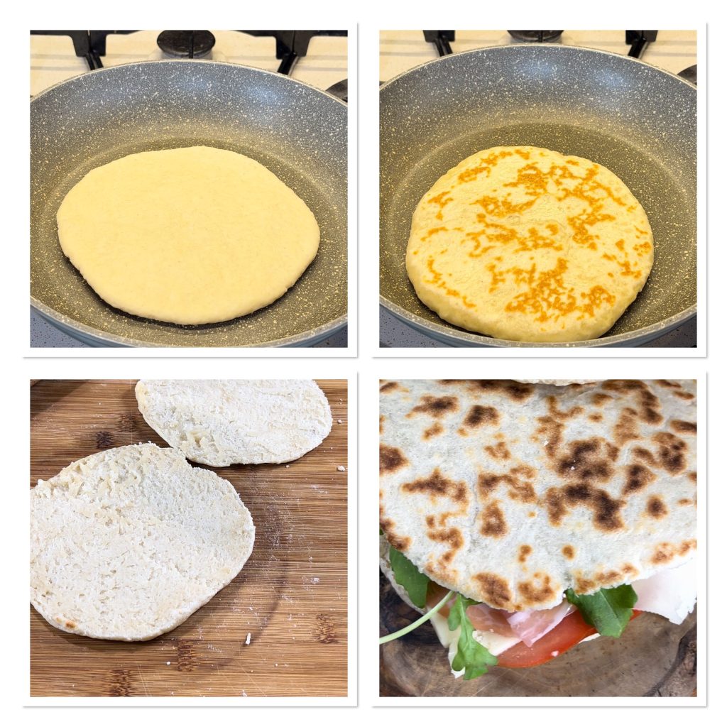 Pan suave con yogur griego, cocinado en sartén de forma rápida y sin levado. Facilísimo y sabroso, el pan de yogur se puede preparar con yogur natural o con yogur griego; cocinado en sartén y sin levado es una alternativa rápida al pan clásico y perfecto para rellenar tanto con dulce como con salado. Es un pan crujiente por fuera y tierno por dentro, aromático y fragante, que se amasa y se cocina en un instante y está listo en 30-35 minutos. Prácticamente son unas focaccias de yogur cocinadas en sartén, que pueden sustituir al pan tradicional y son ideales para llevar a la oficina, a la playa o a la montaña; además son perfectas como recurso para una cena rápida y acompañar embutidos, fiambres, verduras y quesos, y solo hace falta elegir el tamaño del pan para convertirlo en un aperitivo tipo finger food riquísimo. La receta de las focaccias de yogur en sartén o del pan rápido de yogur es muy sencilla, una solución rápida cuando se olvida comprar pan o apetece una cena práctica y diferente. El pan de yogur aporta un dorado, textura aterciopelada y mucho sabor; es perfecto para consumir el yogur que está a punto de caducar y se puede personalizar añadiendo tomates secos, aceitunas o hierbas aromáticas como orégano, tomillo o cebollino al gusto. Incluso podréis rellenar el pan de yogur antes de la cocción y obtener unas focaccias de yogur rellenas. Si queréis unas focaccias de yogur sin gluten en sartén, se puede sustituir la harina clásica por mezcla para masas sin gluten y el resultado será igualmente perfecto. Vamos a la cocina ahora: nuestra receta del pan fácil de yogur cocinado en sartén os espera, pero antes de meter las manos en la masa os recuerdo que si queréis estar al día de todas mis recetas podéis seguir mi página de Facebook (aquí) y mi perfil de Instagram (aquí)!
