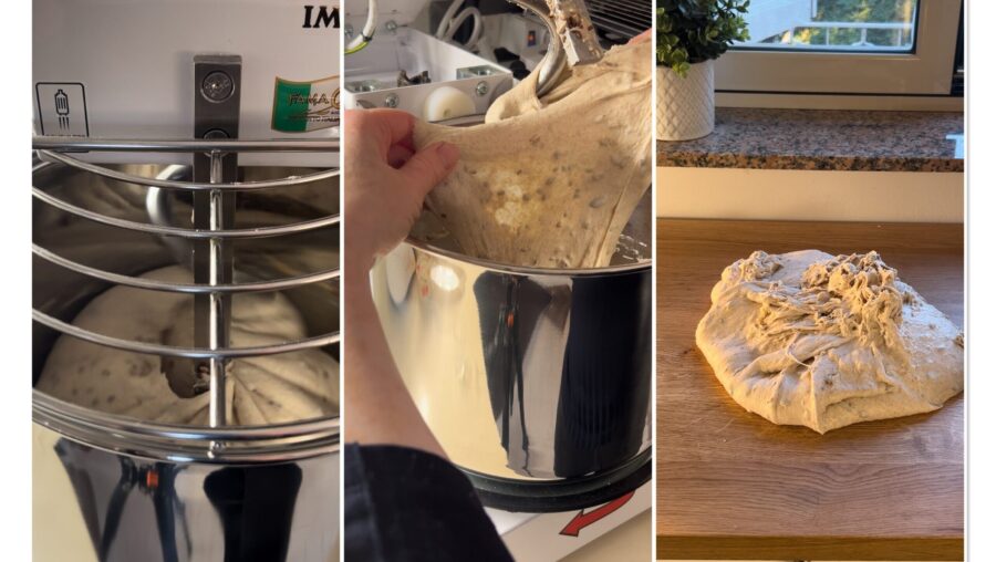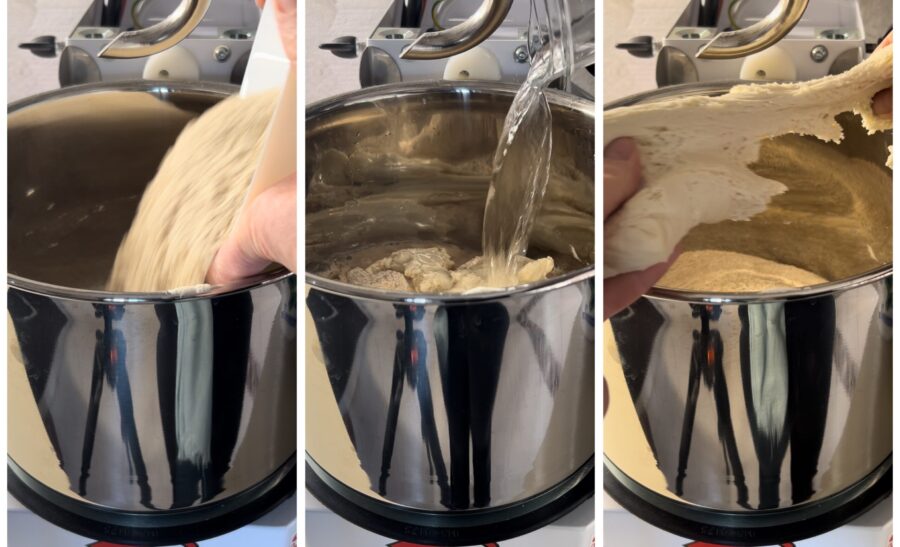 • Verted en el bol de la batidora o la amasadora la harina, el agua y la masa madre. Trabajad durante 10 minutos a velocidad media y esperad a que la masa empiece a engrasarse antes de añadir la sal y la malta (o la miel).