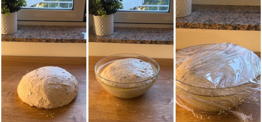 • dadle forma redonda (pellizcadla) y colocadla en un bol de vidrio que previamente habréis untado con abundante aceite; untad también la superficie de la masa.