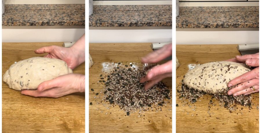 • Continuad amasando hasta que la masa esté formada y perfectamente engrasada —bastarán unos veinte minutos—; añadid 150 g de semillas mezcladas e incorporadlas a la masa.