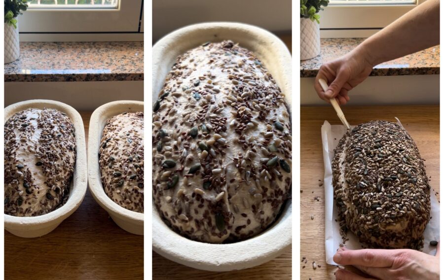 • Colocad las dos hogazas en las cestas, con el cierre del cilindro hacia arriba, y espolvoread con más semillas. Cubrid con un paño y dejad levar en un lugar cálido durante otras tres horas. Pasado ese tiempo y con el pan visiblemente levado, llevad al frigorífico cubierto con film, en la parte baja del mismo, durante unas 10-12 horas.