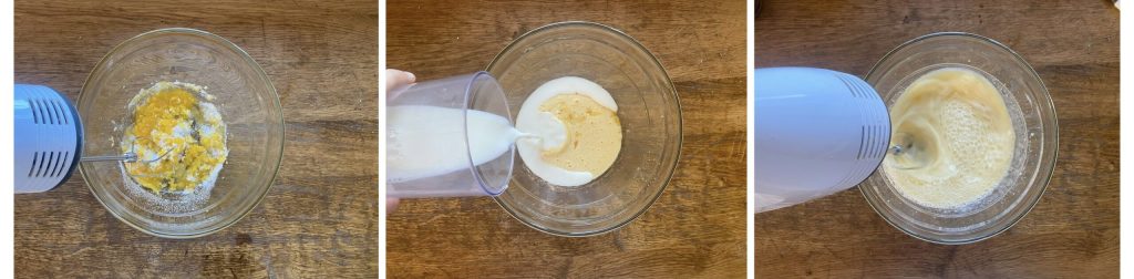 • Seguid mezclando todo con el batidor e id añadiendo poco a poco la harina tamizada y la levadura.