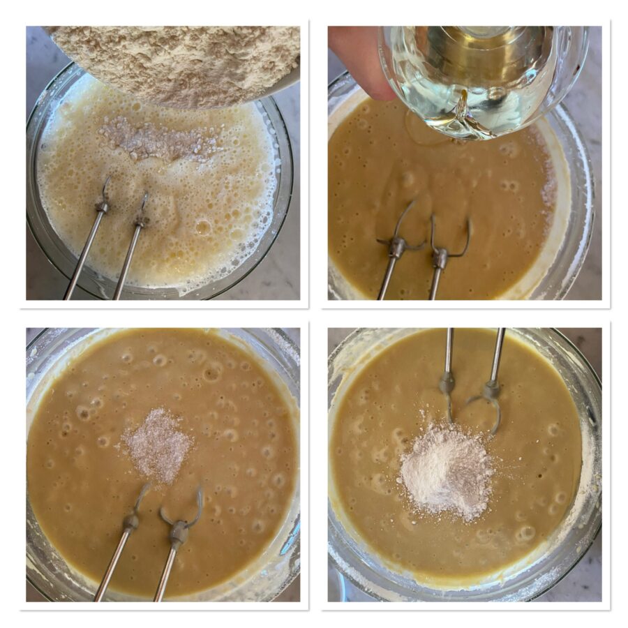 Poco a poco añadid la harina y mezclad hasta obtener una masa lisa y homogénea, incorporad el aceite en hilo y, para terminar, la sal, la vainillina o la esencia de vainilla y la levadura química; mezclad bien todo.