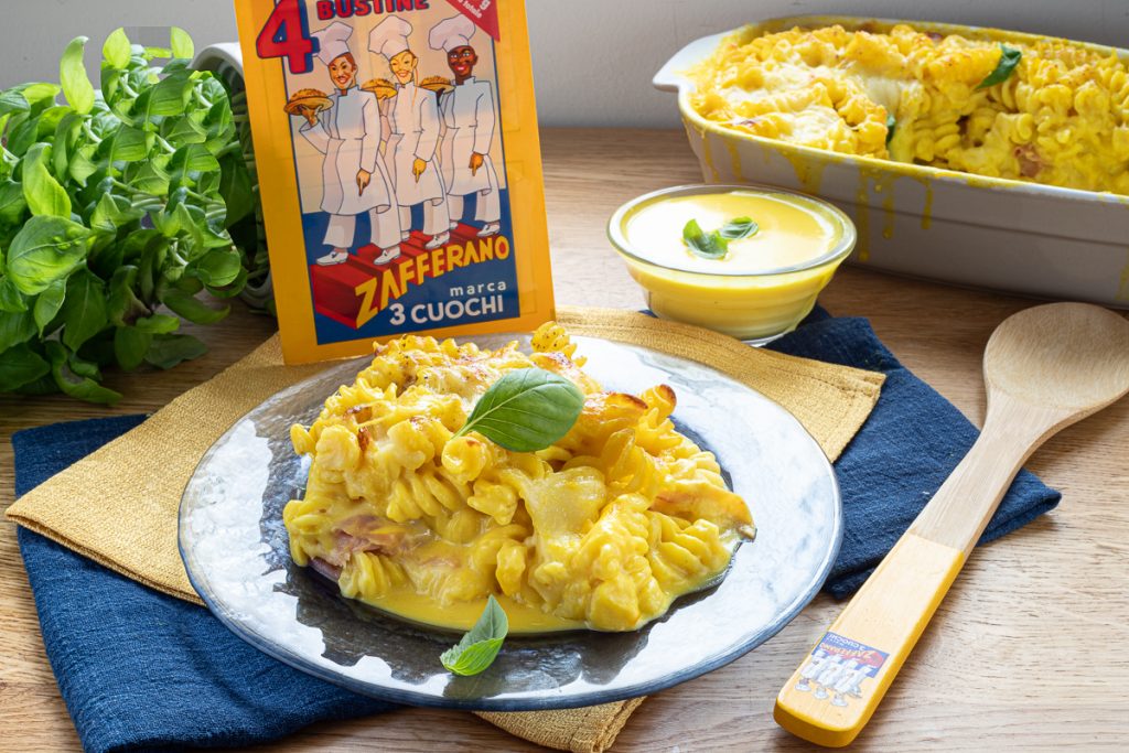 Para una versión vegetariana de esta pasta, sustituye el jamón por provola ahumada y añade guisantes o calabacines salteados. La pasta al horno con azafrán debe servirse caliente y con queso fundido; si sobra, consérvala en el frigorífico y consúmela en un máximo de 24 h tras recalentarla.