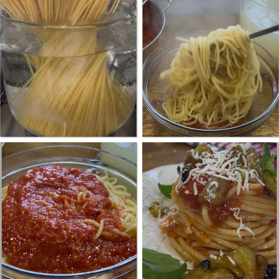 Coced la pasta, escurridla al dente, mezcladla con la salsa de tomate, emplatar, colocad sobre la pasta las berenjenas, espolvoread con una «bella nevada» de ricotta salada y servid enseguida.