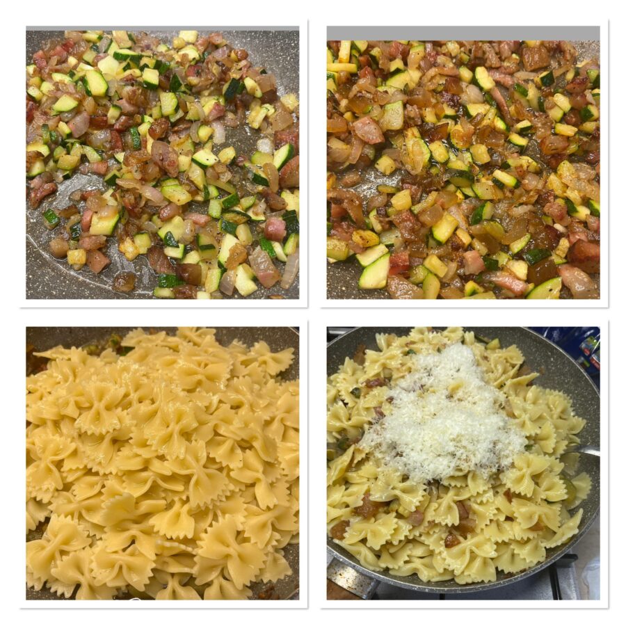 Pasta con calabacines y guanciale, un primer plato rápido que gusta a todo el mundo. La pasta con guanciale y calabacines es un primer plato facilísimo y sabroso que se prepara con pocos ingredientes, pero con un resultado garantizado. Esta pasta rápida y deliciosa se hace solo con guanciale, calabacines, cebolla y pecorino (yo también añado parmesano) y es tan deliciosa que no hace falta añadir nada más. El guanciale crujiente y dorado, en su punto de sal, aporta sabor a los calabacines y todo se realza con el gusto dulce y delicado de la cebolla pochada; en este plato, no hace falta añadir aceite porque basta con la grasa del guanciale. Si estáis buscando un primer plato de pasta con calabacines, este es perfecto. Yo elegí preparar farfalle, pero cualquier tipo de pasta servirá, sobre todo si es corta.