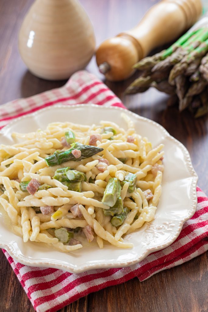 Pasta cremosa de espárragos y panceta, con nata. Cremosa y rápida como el Risotto de espárragos y panceta, la pasta con espárragos, panceta y nata, un primer plato primaveral con espárragos sabroso y sencillo de preparar, tan rico como la Pasta con espárragos y gambas o los Penne con espárragos, patatas y panceta, ideal para un día de celebración o una comida en familia. Para preparar este primer plato bastará con cocer los espárragos con la panceta, añadir la nata y luego condimentar la pasta, emulsionándola con el queso rallado. En este delicioso plato en el que el sabor del espárrago se combina a la perfección con el de la panceta crujiente, el sabor es el protagonista, manteniendo al mismo tiempo una extrema simplicidad en la receta. Vamos a la cocina, la receta es facilísima y la salsa se prepara durante la cocción de la pasta de modo que se cocina todo rápido y, en cuanto la pasta esté lista, ya estará lista para ser enriquecida con este delicioso condimento. Podéis sustituir la nata por ricotta, robiola, queso para untar u otros quesos cremosos. Antes de poneros manos a la obra os recuerdo que si queréis estar al día con las nuevas recetas podéis seguir mi página Facebook y mi perfil Instagram.