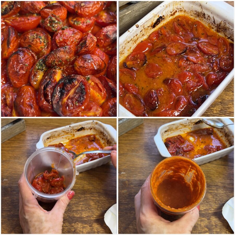 Lava los tomatitos, córtalos por la mitad y colócalos en una pequeña fuente junto con una pizca de orégano, una pizca de ajo y sal al gusto. Añade la mitad de la mantequilla y cocina en la freidora de aire a 200°C durante 20 minutos (o en el horno ventilado, con el mismo modo).