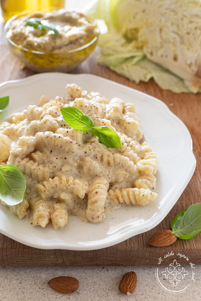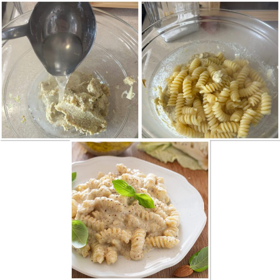 Para obtener una consistencia aún más cremosa, basta añadir al pesto unas cucharadas del agua de cocción de la pasta y mezclar hasta obtener una crema lisa y aromática. De este modo el condimento se adhiere perfectamente a formatos de pasta corta como fusilli, maccheroni o penne e incluso a pasta casera como Busiate o Maccheroni al ferretto.