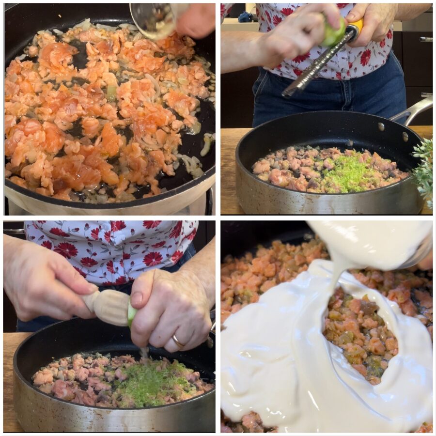 • Para preparar la pasta con salmón ahumado, nata y limón, pelad y picad la cebolla, sofreídla con un buen chorro de aceite y dejad que se ablande. Añadid el salmón ahumado cortado en trocitos y
