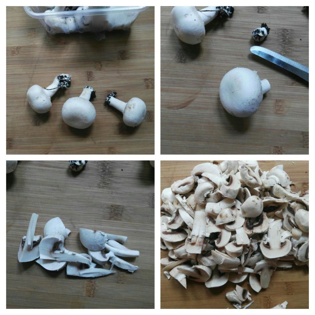 Lamina todas las setas; yo usé champiñones frescos, económicos y sabrosos, y añadí trozos de boletus congelados. De todas formas puedes usar las setas que prefieras, incluso una mezcla congelada.