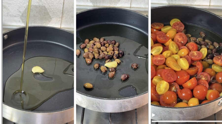 Para preparar la Pasta con tomatitos amarillos y rojos y aceitunas taggiasche, calentad un diente de ajo con un buen chorro de aceite, esperad a que coja un ligero color y añadid primero las aceitunas y luego los tomatitos. Ajustad de sal y cocinad hasta que estén tiernos.