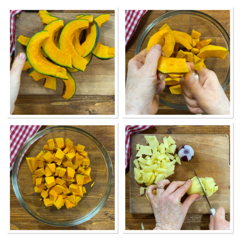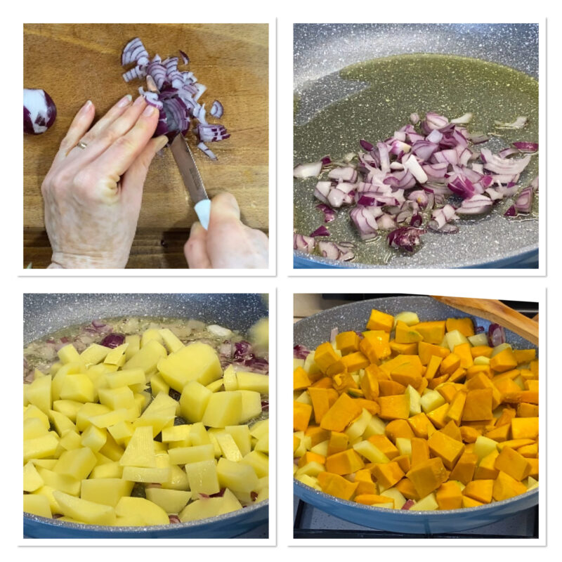 Añade las patatas y la calabaza, salpimienta y deja que se doren a fuego vivo; luego baja el fuego y deja cocer durante 35 minutos, removiendo de vez en cuando.