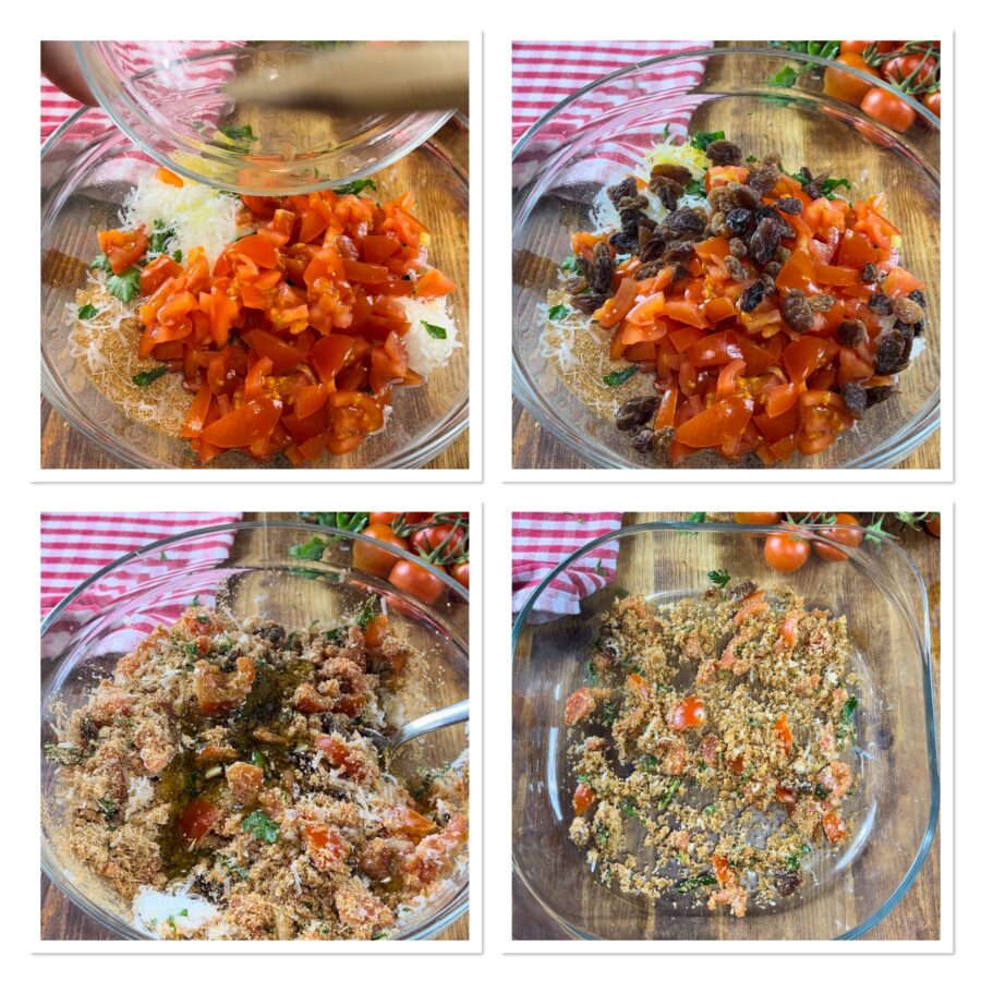 • Lava los tomatitos y córtalos. Añade al pan rallado el queso rallado, el ajo rallado, la ralladura de limón y el perejil picado.