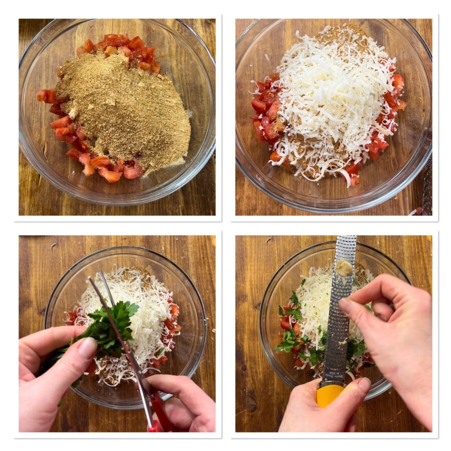 Vierte el pan rallado en una sartén, tuéstalo. Lava y corta los tomates en trocitos, recógelos en un bol y añade el pan rallado.