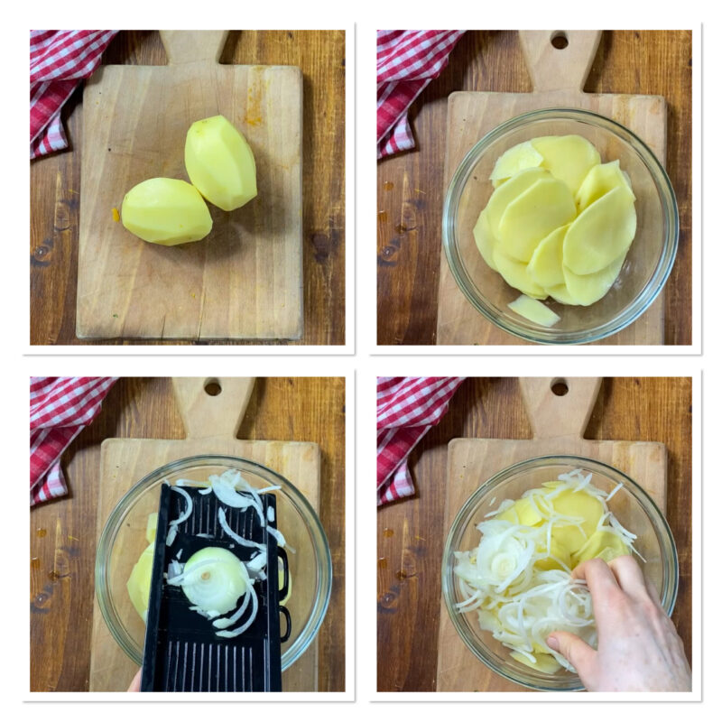 • Pelad las patatas y la cebolla y cortadlas también con la mandolina; en este caso, aliñad igualmente con sal, aceite y pimienta.