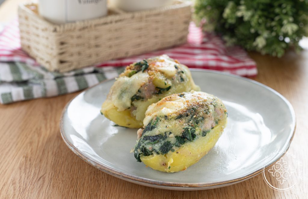 Patatas al horno rellenas de salchicha y espinacas, un segundo plato fácil y sabroso, pero también una guarnición o un entrante delicioso, justo como los Pastelitos de patata individuales. Las barquitas de patata son una preparación sencilla que se puede adaptar de mil maneras y que siempre queda buenísima, igual que estas patatas rellenas de salchicha y espinacas. La patata es uno de los ingredientes básicos de nuestra cocina y las recetas con patata son siempre la solución adecuada cuando quieres llevar a la mesa algo económico y apetecible a la vez. Entre mis recetas favoritas están las barquitas de patata al horno y he preparado varias, como las Barquitas de patata con atún y mayonesa, las patatas rellenas con mortadela y queso, las Patatas rellenas con setas y las Patatas rellenas cremosas con jamón, provola y parmesano. Hoy, inspirado por estas ideas tan ricas, he pensado en preparar una versión con salchicha y espinacas super rica, perfecta para llevar a la mesa como segundo, como plato único, pero también como entrante o guarnición: ¿la probamos? Vamos a la cocina que os explico la receta, pero antes os recuerdo que si queréis estar al día de todas mis recetas podéis seguir mi página de Facebook (aquí) y mi perfil de Instagram (aquí) y que aquí encontraréis muchas Recetas con espinacas igualmente deliciosas.