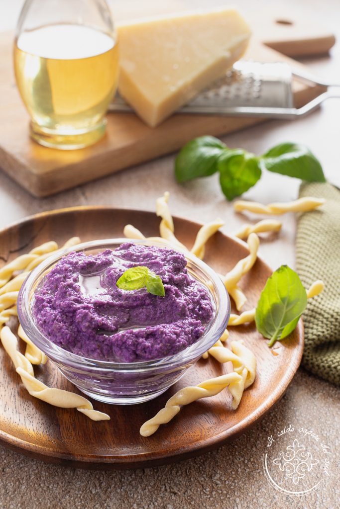 El resultado es una crema de color violeta brillante, perfecta como pesto para la pasta, pero también estupenda para rellenar bocadillos, tortas saladas o acompañar segundos platos.