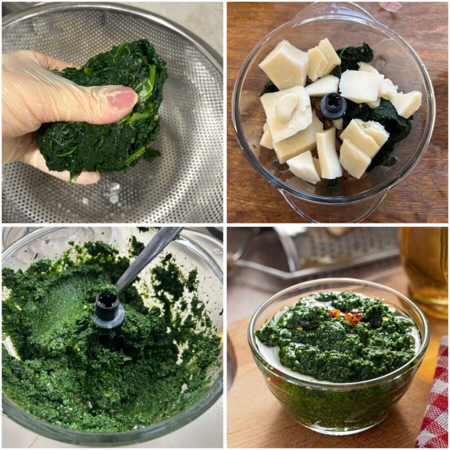 • Una vez cocida, escurridla y pasadla a un escurridor, dejándola reposar unos minutos para eliminar el exceso de agua. Después, exprimid bien las hojas con las manos para eliminar la humedad residual y evitar que el pesto quede demasiado líquido.