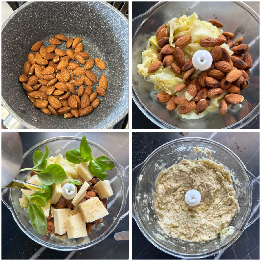 Trasladad a la batidora la col cocida y escurrida, las almendras tostadas, el ajo, el parmesano, el pecorino y las hojas de albahaca si es temporada.