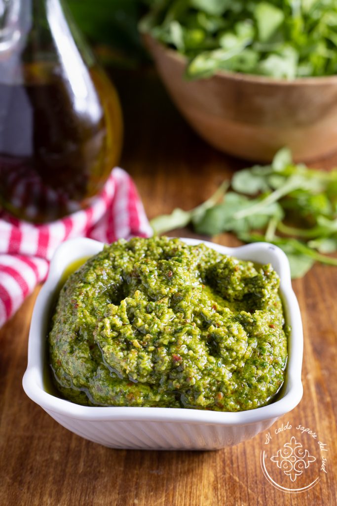 Pesto de rúcula y almendras con tomates secos, otro aderezo que forma parte de nuestra colección dedicada a los pestos caseros, sencillo y rápido como el Pesto de rúcula y almendras. Quizá soy de esas pocas personas en el mundo a las que no les entusiasma especialmente el pesto genovés, es decir, el pesto de albahaca; lo como, pero no me apasiona y tiene que ser fresco y hecho en casa. En cambio, me encantan todas esas otras cremas que, por no ser verdaderos pestos sino salsas, reciben este nombre, por ejemplo el Pesto de berenjenas y albahaca, el Pesto de brócoli y almendras, el Pesto de pimientos asados, etc. Uno de mis preferidos es, además, el pesto de rúcula y almendras, una receta facilísima y rápida para un aderezo muy delicado y sabroso, ideal para preparar en verano y también para aliñar la pasta fría. Vamos a la cocina: os cuento cómo hacer el pesto de rúcula, pero antes os recuerdo que si queréis estar al día con todas mis recetas, podéis seguir mi página de Facebook (aquí) y mi perfil de Instagram (aquí).