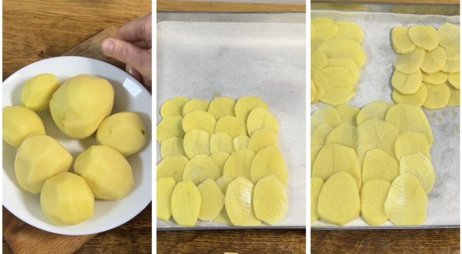 Pelad y enjuagad las patatas, luego cortadlas en láminas muy finas. Colocad las patatas en espiga directamente sobre la bandeja forrada con papel de hornear ligeramente engrasado y formad 3 cuadrados de aproximadamente 20-22 cm por lado.