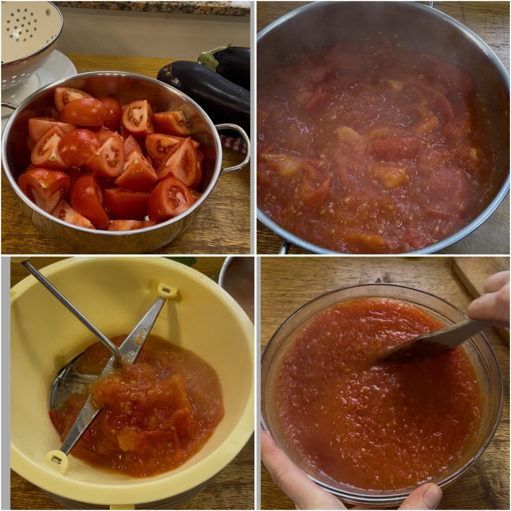 Cuando estén muy blandos y deshechos, apaga el fuego y pasa los tomates por un pasapurés de orificios medianos, recogiendo el puré en un bol.