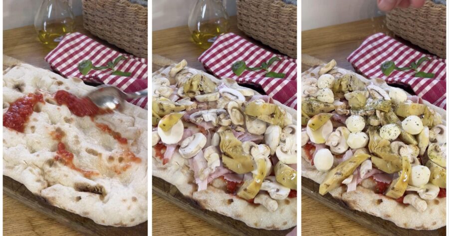Pinsa caprichosa con champiñones y alcachofas, la pinsa rápida, sabrosa y ligera para una cena irresistible lista en 5 minutos. Si nunca sabes cómo condimentar la pinsa precocida, aquí tienes una idea deliciosa para una pinsa sabrosa: la pinsa caprichosa con champiñones, alcachofas, jamón cocido y mozzarella, ¡una mezcla de aromas y sabores únicos que te regalará una auténtica pinsa gourmet! ¿Recordáis la Pinsa alla Norma con berenjenas fritas o la Pinsa a la parmesana y la Pinsa de mariscos? Si habéis comprado pinse y todavía no sabéis cómo decorarlas, añadimos a los consejos anteriores otra idea para condimentar la pinsa precocida de forma apetecible: la pinsa caprichosa. ¡Un derroche de sabor y color que os permitirá llevar a la mesa una cena deliciosa y sin estrés! Vamos a la cocina ahora, pero antes de ponernos manos a la obra os recuerdo que si queréis estar al día de todas mis recetas podéis seguir mi página de Facebook (aquí), mi perfil de Instagram (aquí).