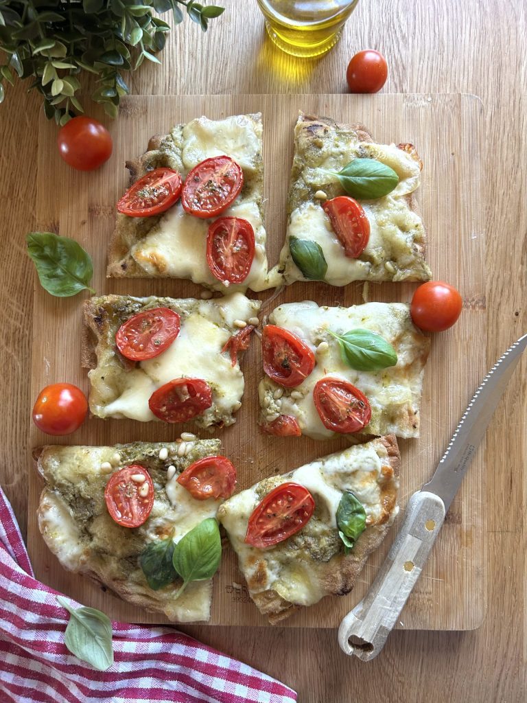 Si nunca sabéis cómo rellenar la pinsa, aquí tenéis una idea deliciosa: la pinsa con pesto de albahaca, tomatitos y piñones, una receta sencilla, rapidísima y sabrosa para una auténtica pinsa gourmet. ¿Os acordáis de la Pinsa alla Norma con berenjenas fritas o de la Pinsa a la parmesana y la Pinsa con frutos de mar? Si habéis comprado la pinsa y no sabéis cómo cubrirla, añadimos a las sugerencias anteriores otra idea para rellenar la pinsa precocida de forma apetecible: la pinsa con pesto y tomatitos. Os aseguro que esta pinsa gourmet, original y sabrosa, os sorprenderá a todos y en pocos minutos y con pocos ingredientes llevaréis a la mesa sabor y alegría —¡y quedaréis genial! ¿Preparados para descubrir una forma nueva de rellenar la pinsa? Vamos a la cocina, pero antes de ponernos a cocinar os recuerdo que si queréis estar al día de todas mis recetas podéis seguir mi página de Facebook (aquí) y mi perfil de Instagram (aquí).