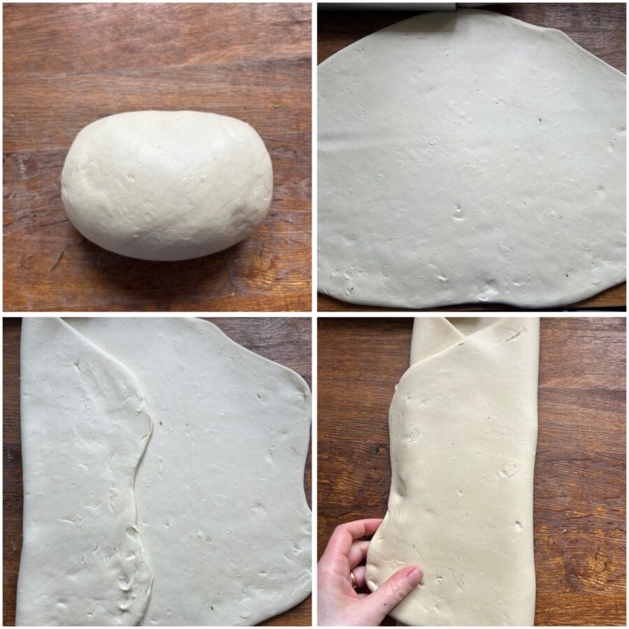Retoma la masa, estírala con el rodillo y dale un pliegue en forma de cartera. Este gesto nos ayudará a conseguir un ligero hojaldrado y muchas burbujas en la fritura.