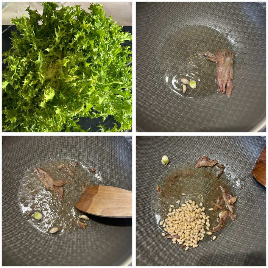 Lavádla cuidadosamente, eliminad las partes más duras y rompédla a trozos con las manos. En una sartén amplia calentad un chorrito de aceite de oliva virgen extra, añadid un diente de ajo y los filetes de anchoa. Dejad que las anchoas se deshagan suavemente y agregad los piñones, seguidos por las pasas y las aceitunas.
