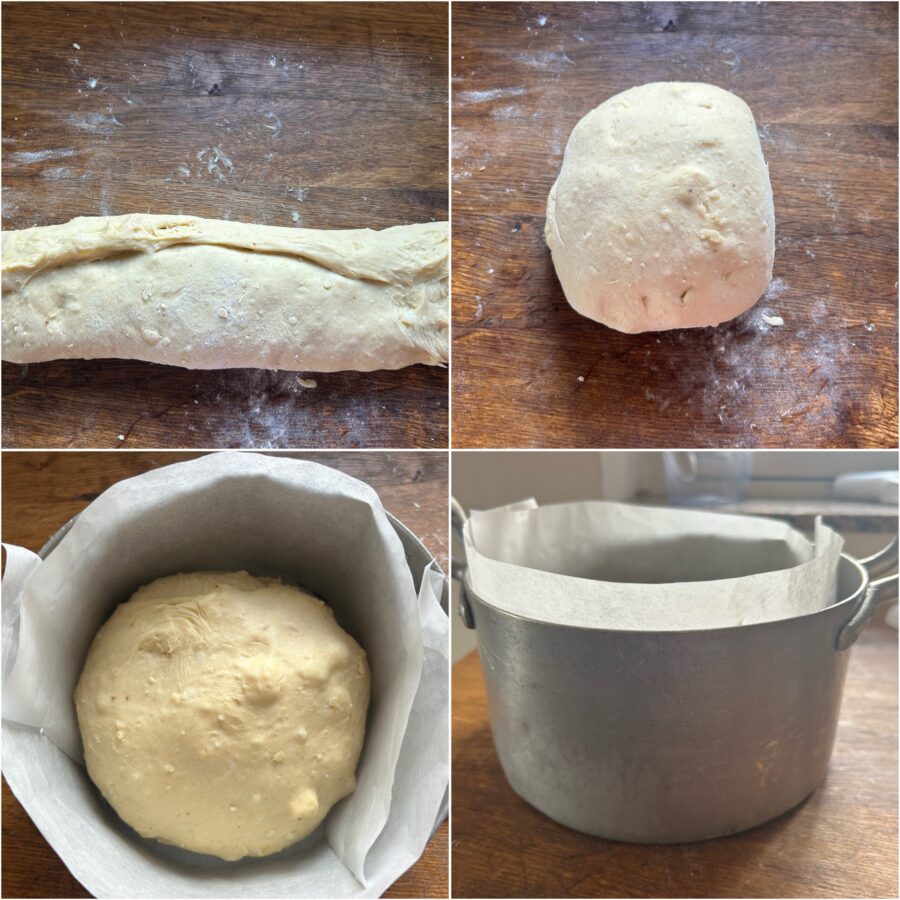 El molde debe ser alto y estrecho: podéis usar un molde de panettone o un clásico molde de aluminio forrado con papel de horno, o una cazuela del tamaño adecuado que pueda ir al horno.