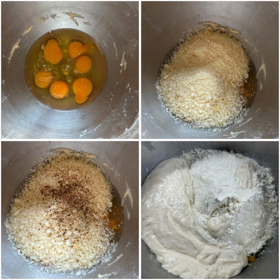 • Echad en el bol de la amasadora los huevos, añadid el queso rallado y una molida de pimienta, y comenzad a mezclar con el gancho.