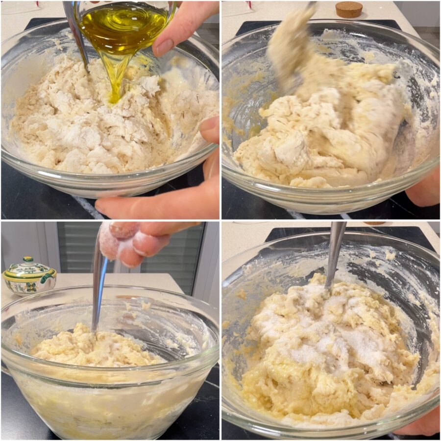 • Incorporad la levadura, mezclad y, cuando la masa empiece a tomar consistencia, añadid el aceite en hilo e id integrándolo poco a poco.