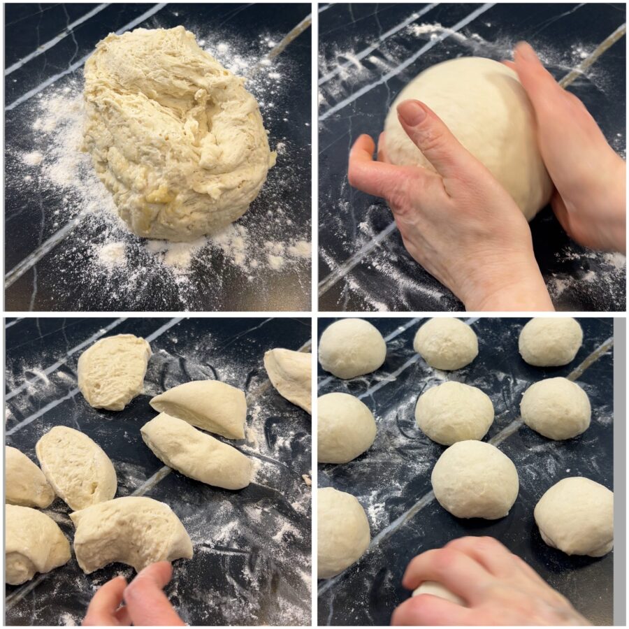 Dividid la masa en 10 porciones pequeñas y formad bolitas todas del mismo tamaño; dejadlas levar de nuevo hasta que doblen su tamaño, esto llevará unos 35-45 minutos aproximadamente.