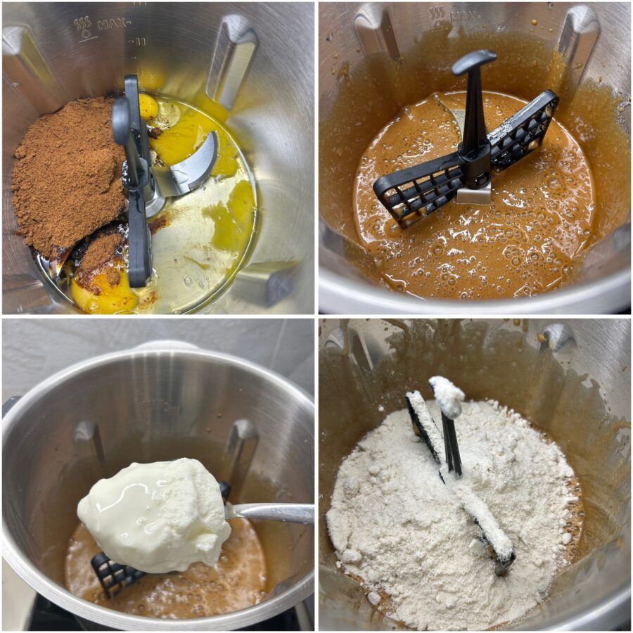 Colocad en el vaso de la batidora los huevos, el azúcar y el aceite. Batid durante 3 minutos a velocidad media; si tenéis el accesorio para montar, utilizadlo. Cuando obtengáis una mezcla espumosa, añadid el yogur, la harina y el okara de almendras.