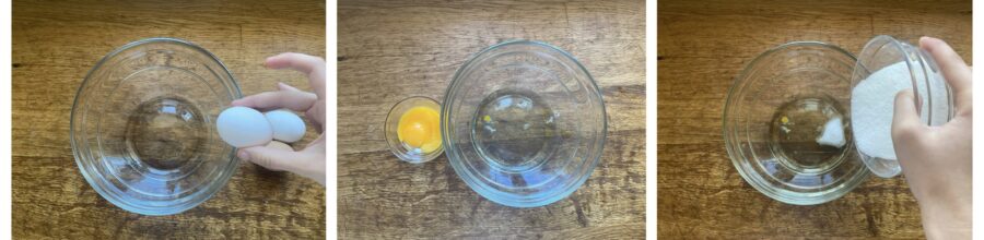 • Separa las claras de las yemas en dos boles y reserva las yemas. Añade el azúcar a las claras.