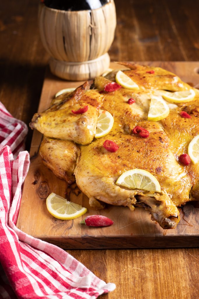 Pollo a la diavola en sartén, la receta de la abuela infalible como el pollo al horno con patatas, pero hecho en sartén y perfecto si hace demasiado calor y no quieres encender el horno. ¿Conocéis el pollo aplastado cocinado en sartén? ¿No? Sepan entonces que no es otra cosa que el delicioso pollo a la diavola y que se hace realmente con facilidad. Crujiente, jugoso, delicioso, aromático, apetecible y de sabor único, al pollo a la diavola no se le puede decir que no. No se sabe quién lo inventó ni quién por primera vez se decidió a cocinar el pollo de esta manera; sus orígenes son inciertos. Su nombre probablemente deriva de las abundantes especias picantes utilizadas, ante todo el chile, y de la forma característica. No os preocupéis, sin embargo: la receta de la abuela del pollo a la diavola que yo hago no es tan picante, está pensada para todos y además podréis aumentar el picante según vuestros gustos. Como os decía, la característica del pollo a la diavola no es solo el sabor, sino también el método de cocción, que yo hago en sartén, pero con un peso encima del pollo para que se aplaste y quede pegado a la sartén. ¿Queréis probar a hacerlo? Pues vamos a la cocina, la receta del pollo a la diavola en sartén nos espera, pero antes de poneros a cocinar os recuerdo que si queréis estar al día con todas mis recetas, podéis seguir mi página de Facebook (aquí) y mi perfil de Instagram (aquí).