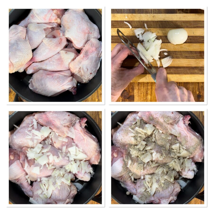 Prepara el pollo: córtalo en porciones, elimina las plumas y las partes más grasas, pero deja la piel. Colócalo en una cazuela amplia, pela, enjuaga y pica la cebolla; distribúyela sobre el pollo, espolvorea con los condimentos para asado y pon la cazuela al fuego.