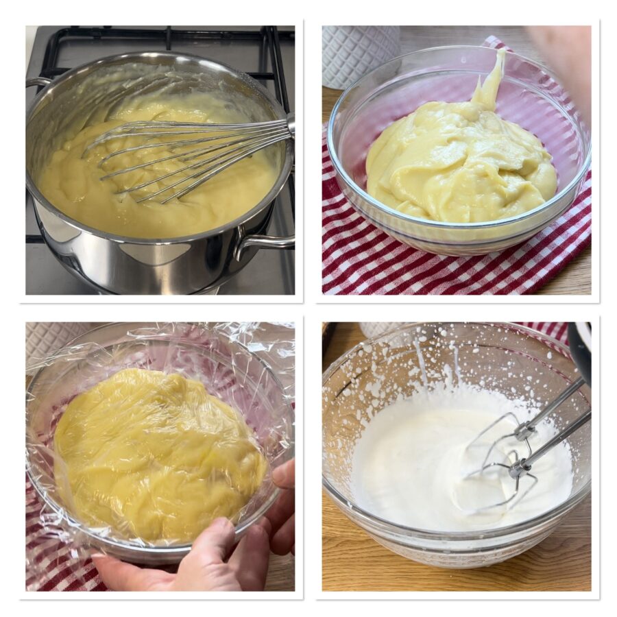 • Deja que espese a fuego moderado removiendo continuamente. Apaga, retira la ralladura de limón, bate un poco más con las varillas y deja enfriar la crema en un bol cubierto con film. Con la crema fría y nunca antes, semi-monta la nata.